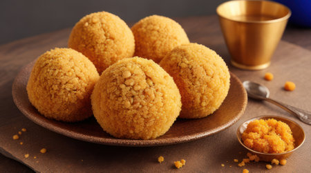 Top view of sweet besan ladoo on a plate, a traditional South Asian dessert for kids