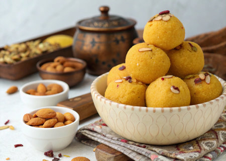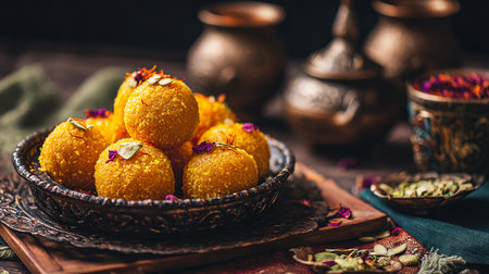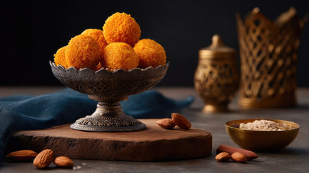 A visually rich image featuring a decorative copper bowl filled with vibrant orange motichoor ladoos, placed on a wooden surface adorned with almonds and yellow flower petals. The softly blurred background with warm tones and traditional decor evokes a festive and cultural atmosphere, ideal for themes related to Indian cuisine, celebrations, and editorial food photography.