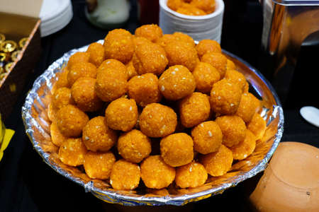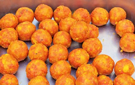 Traditional Indian dish: motichoor laddoo or bundi laddoo - ball shaped sweets with sugar, nuts, ghee on counter at summer food market: close up. Vegetarian, dessert, sweet food concept