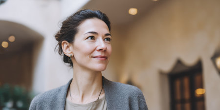 A woman is walking in a corridor with soft lighting. She looks ahead with a thoughtful expression. The setting has neutral colors and some background details visible.