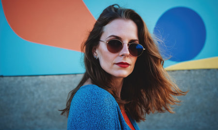 A woman with long brown hair and sunglasses stands in front of a wall with colorful abstract designs