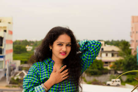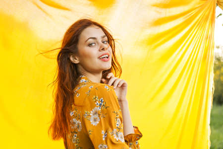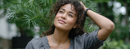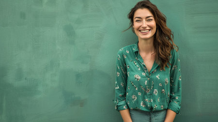 A woman in a green floral dress is smiling and posing for a picture. Concept of happiness and positivity