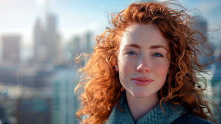 A young woman with wavy brown hair and striking blue-green eyes looks directly at the camera. She is wearing a light-colored, textured blouse with puffed sleeves. The background is blurred, suggesting an outdoor urban setting with modern architecture.