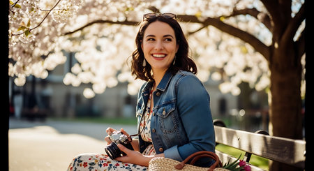 Portrait of a beautiful young woman sitting on a bench in the park and holding a camera