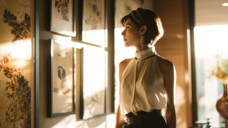 A thoughtful woman gazes at beautiful artworks illuminated by golden sunlight in a chic space.