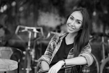 Portrait of smiling young middle aged white caucasian girl woman with short hair stylish haircut in t-shirt looking away outside in summer park