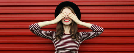 Portrait of happy young woman covering her eyes with her hands wearing a black round hat on a red background