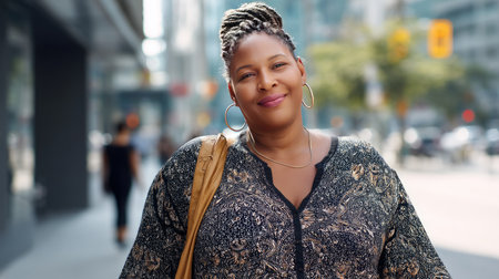 An overweight woman in her 40s walking confidently down the street, wearing stylish clothing and a smile, with city life in the background.