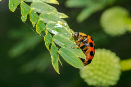 Ladybug with red stripes, black, walking on leaves, beautiful morning.