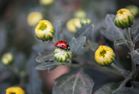 A vibrant composition showcasing colorful ladybugs in red and yellow against a soft green background. Ideal for nature themes, minimalistic art, and design elements.