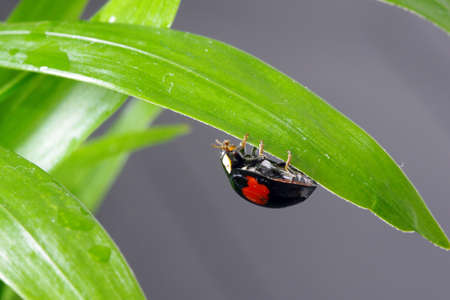 Ladybird bright red on a juicy yawning sheet. High quality photo