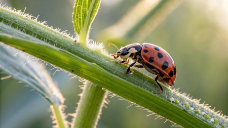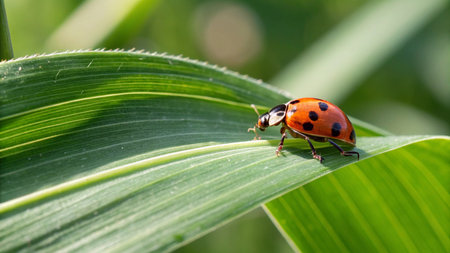 Spotted ladybug crawling on green plant leaf generated by artificial intelligence