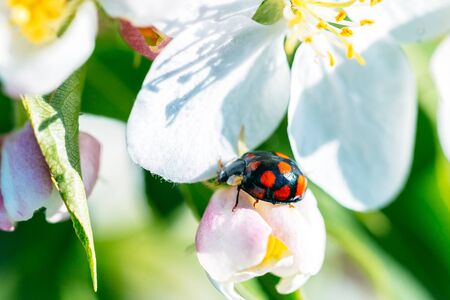 Insects in the suburban area. Spiders, ladybugs. Macro shot on green leaves. Nature, spring. Copy space