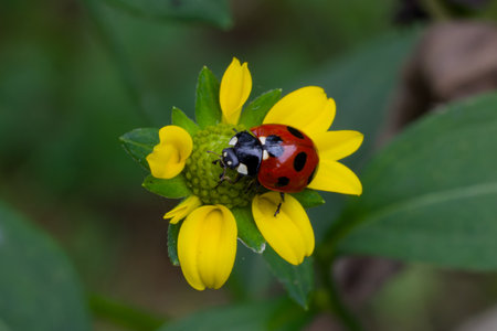 Closeup of a ladybug on green leaves, showcasing natural wildlife and macro photography of this charming insect