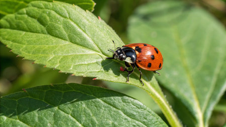 Close-up view of an orange ladybug adorned with black spots, crawling delicately on a vibrant green leaf, highlighting the intricate beauty of insect life in nature's ecosystem