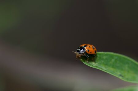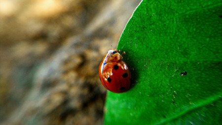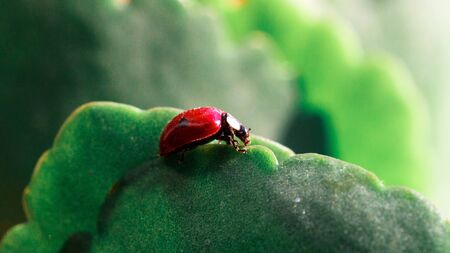 Close up of ladybug crawling on a green leaf, macro photograhpy.