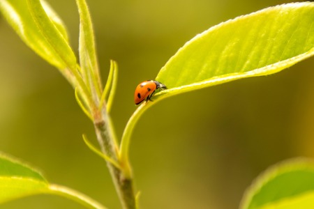 ladybird on leaf of a plant on green and light background