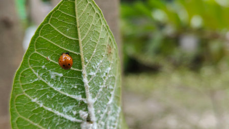 Photo of Coelophora inaequalis and White lice on a leaf. This photo can be used for learning, presentation, biodiversity, wallpaper and so on.