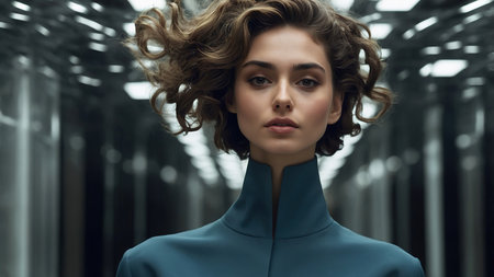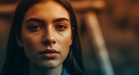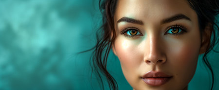 Intense gaze of a young woman against a vivid turquoise background, portrait