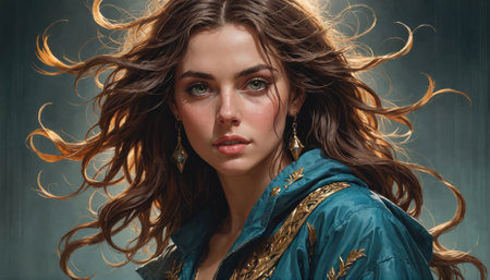 An AI generated illustration of Her piercing blue eyes serve as the focal point, contrasting the warm golden tones that envelop her.