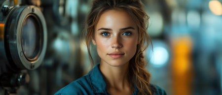 Engineer woman, machinery backdrop, sharp focus, steel hues, ambient workshop light