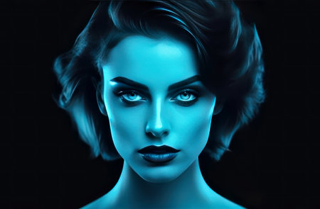 Captivating blue-toned portrait of a woman with a mesmerizing gaze. Perfect for modern art projects or background wallpapers.
