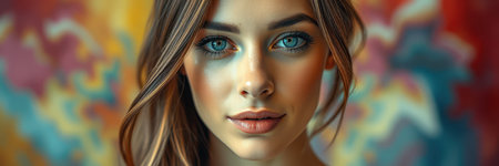 Young woman with striking blue eyes poses in front of a colorful abstract background during a creative photoshoot