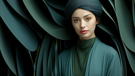 A stunning woman in a vibrant green dress exudes confidence and elegance, with her captivating human face framed by the delicate folds of her clothing in a portrait-worthy image of timeless fashion