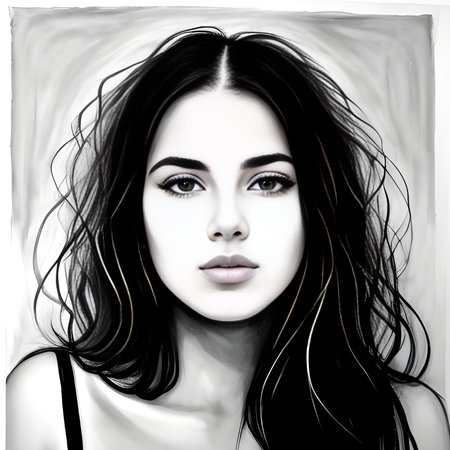Portrait of a beautiful young woman with long black hair. Black and white.