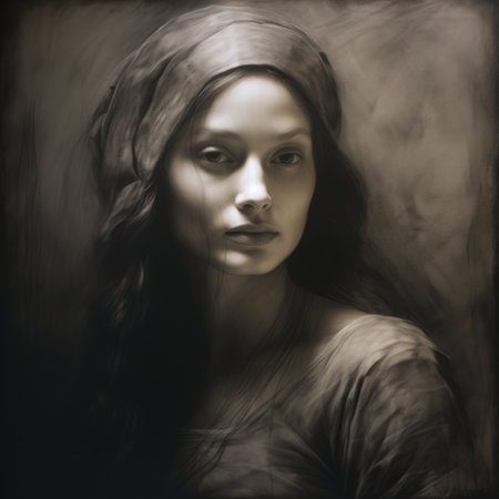 a mesmerizing portrait of patricia, reminiscent of leonardo da vinci's charcoal drawings. the weathered face is meticulously captured, showcasing the mastery of chiaroscuro. the intense gaze and subtle shading bring life to the drawing, evoking a sense of timelessness and wisdom. against a simple, monochromatic background, the intricate details of the subject take center stage. ai generated