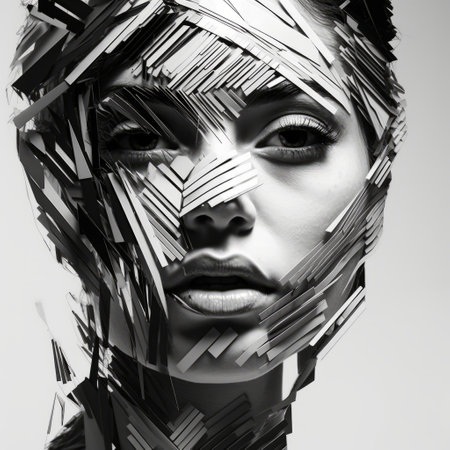 a person's face created with black and white papers, showcasing a futuristic glam style. the image features distorted and fractured depictions, resembling realistic hyper-detailed portraits. created using daz3d software, the artwork incorporates heavy use of palette knives. this ultra-high-definition (uhd) image requires minimal retouching. ai generated
