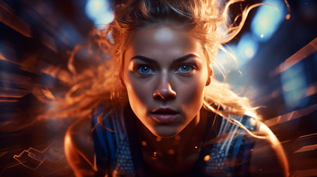 young woman art. Bright hues, dynamic shapes frame figure in advanced gear with sleek headset, evoking sense of innovation, energy, intersection of humanity with technology