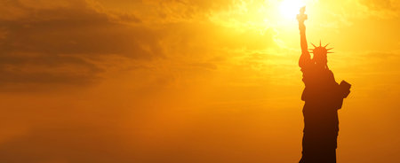 Statue of Liberty silhouette on sunset background. American holiday concept. USA.
