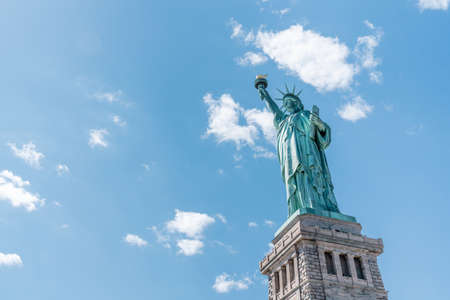 Sunnny day, blue sky with clouds: statue of Liberty with copy space