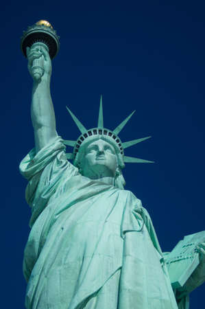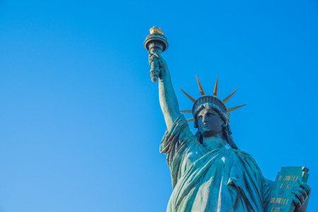 Statue of Liberty on sunny day, clear blue sky background. United States nation symbol, travel destination or America tourist attraction concept