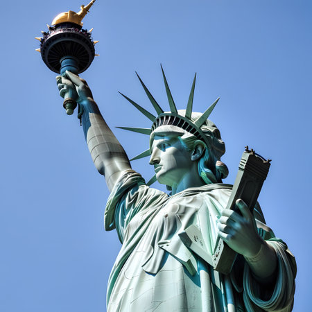 iconic statue stands tall against bright blue sky, symbolizing freedom and hope.