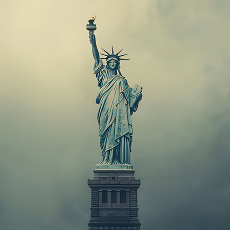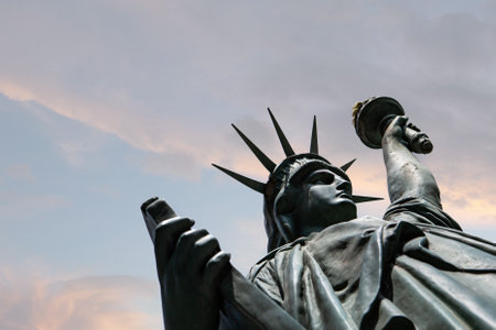 The Statue of Liberty, a symbol of freedom and democracy, stands tall against a backdrop of a beautiful sky.