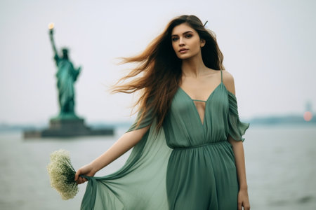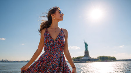 A woman in a patriotic dress standing in front of the Statue of Liberty, bright sun, clear skies. Election Day in the USA. America Day. Festive Mood on President's Day.