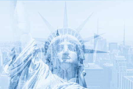 Double exposure of Manhattan skyline in new york city with statue of liberty silhouette