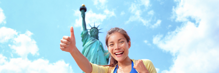 New York City tourist woman at Statue of Liberty happy doing thumbs up banner panorama. Asian girl on USA vacation travel. Young multiracial woman Asian Caucasian woman student with bag .