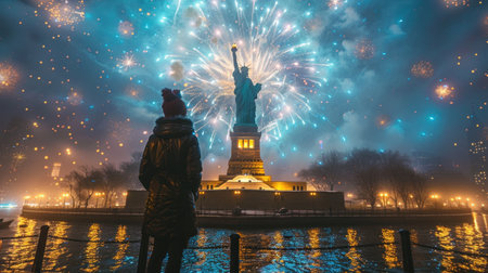 Festive fireworks illuminate the night sky above the Statue of Liberty celebrating the spirit of independence and liberty in a dazzling display