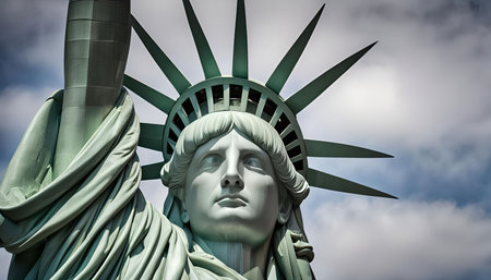 A close-up shot of the Statue of Liberty, highlighting the face and crown of the iconic landmark. It symbolizes freedom, democracy, and hope.