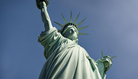 A low-angle close-up of the Statue of Liberty in New York City, emphasizing its towering height and iconic stature. The statue is a symbol of freedom and democracy in the United States, inspiring awe and pride in visitors from around the world.