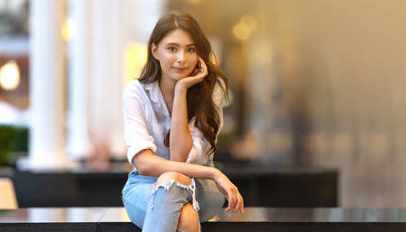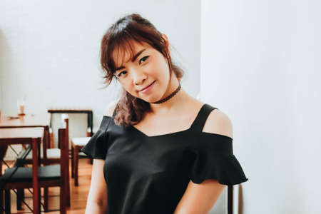 Beautiful young woman posing alone in the cafe, Model is Thai Ethnicity.