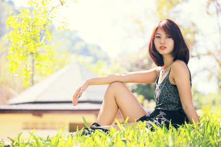 Young Asian Girl sitting in the garden and touches own hair. Can be used as concept photo