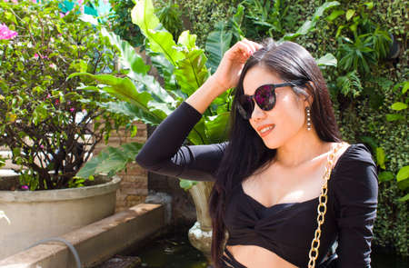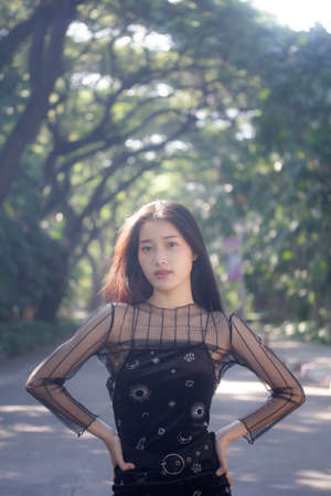 asia thai teen black dress beautiful girl smile and relax