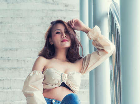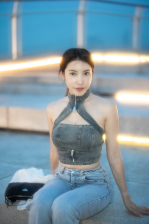 portrait of Beautiful Asian woman sitting on the overpass