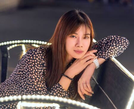 Portrait of a woman sitting on bright Bokeh light on chair decoration in Outdoor Festive Market