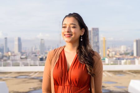 Happy young beautiful Indian woman thinking against view of the city