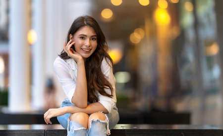 Young beautiful asian girl in big mall, bangkok. Stylish shopping trip